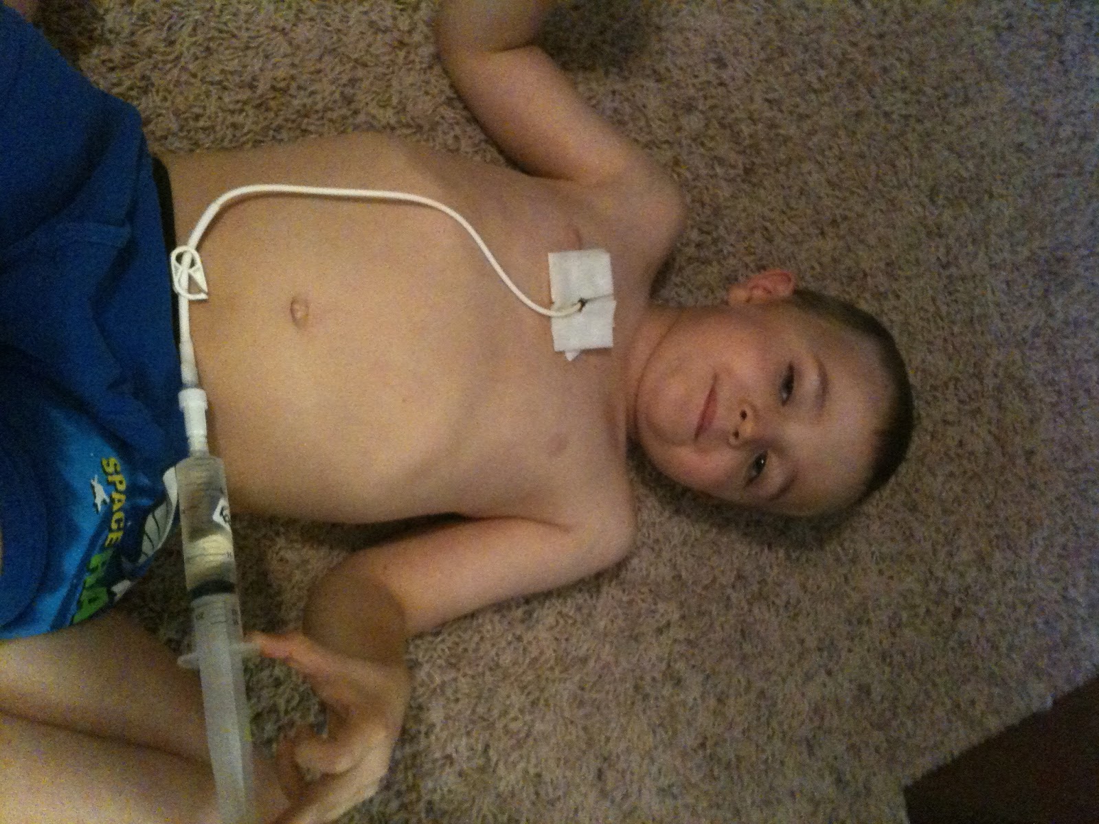 Joey had blood drawn from his line and from his arm, so he had to get poked and he wasn't happy about it. They have him "special cream" and he didn't feel a thing. Luckily his labs were high enough that he didn't have to be admitted to the hospital. However, we learned 2 days later that he has an infection in both his blood and his central line. There is no way to know where it was first. He had just been off his antibiotic for his sinus infection for about a week and a half, so I was sort of surprised. He is now getting a very large dose of antibiotic each day through his line.